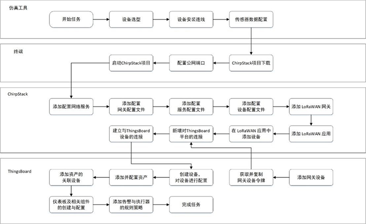 模擬智慧牧場系統(tǒng)還引入使用開源軟件平臺ChirpStack與ThingsBoard,結合LPWAN技術,實現(xiàn)遠程低功耗數(shù)據(jù)采集、上報和展示。在ChirpStack平臺上,用戶可對網關、GPS、溫濕度傳感器等設備進行配置,以上送仿真實驗中的虛擬數(shù)據(jù)。在ThingsBoard平臺上,設置牧場地圖、告警信息、溫濕度等各儀表盤組件;獲取仿真設備上送的數(shù)據(jù),并將數(shù)據(jù)以圖表形式作可視化呈現(xiàn);以及基于流式編程添加相應的規(guī)則策略,最終完成模擬智慧牧場實訓場景的部署搭建。