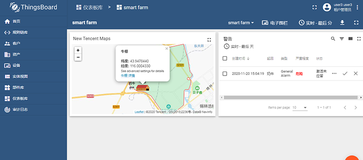 圖:智慧牧場課程案例,使用GPS對奶牛位置進行定位,通過LoRa網絡將位置信息上報,使用ThingsBoard平臺的電子圍欄工具結合騰訊地圖,實現(xiàn)奶牛越過電子圍欄時發(fā)送警報提醒。