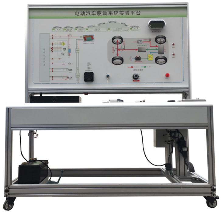 檢測控制面板(裝有各種檢測端子,1448×940mm彩色電路圖和工作原理示意圖)、組合儀表、點火開關(guān)、電機(jī)控制器、車載充電器與充電接口、DC-DC轉(zhuǎn)換器、鋰動力電池組、電動車電機(jī)(直流無刷電機(jī))與變速箱、后輪左右液壓制動裝置、驅(qū)動橋傳動裝置、剎車開關(guān)、檔位開關(guān)、油門控制裝置、大電流繼電器、電源總開關(guān)、急停開關(guān)、輔助蓄電池(12V45AH)、一體化全鋁合金型材搭建的移動臺架(1500×700×1700mm (帶自鎖腳輪裝置,帶安裝檢測端子的原理面板,面板1448×940mm)、故障考核系統(tǒng)、設(shè)備操作說明書。