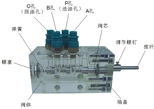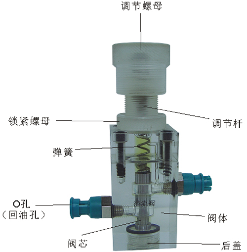 2、溢流閥結(jié)構(gòu)上參考了國產(chǎn)P-63B型低壓直動式溢流閥,其閥體閥蓋、鎖緊螺母、調(diào)節(jié)螺母、螺塞等采用了進口透明有機玻璃材料精制而成,閥芯、調(diào)節(jié)桿采用了45#中碳鋼材料。并配合彈簧,油接頭,密封圈等標準件裝配而成,通過它可明確地觀察到閥芯、彈簧、油孔等結(jié)構(gòu)及其運行過程,具有形象逼真,性能可靠等優(yōu)點。它即可作為教學(xué)模型,也可以作為液壓實驗元件進行實驗演示。