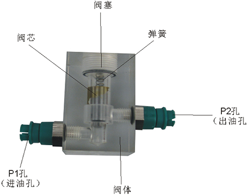 2、單向閥結(jié)構(gòu)上參考了國產(chǎn)I--63B型板式單向閥,其閥體,螺塞等采用了進口透明有機玻璃材料精制而成,閥芯采用了45#中碳鋼材料,并配合彈簧,油接頭,密封圈等標準件裝配而成,通過它可明確地觀察到活塞、彈簧、油孔等結(jié)構(gòu)及其運行過程,具有形象逼真,性能可靠等優(yōu)點。它即可作為教學(xué)模型,也可以作為液壓實驗元件進行實驗演示。