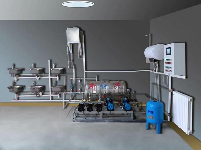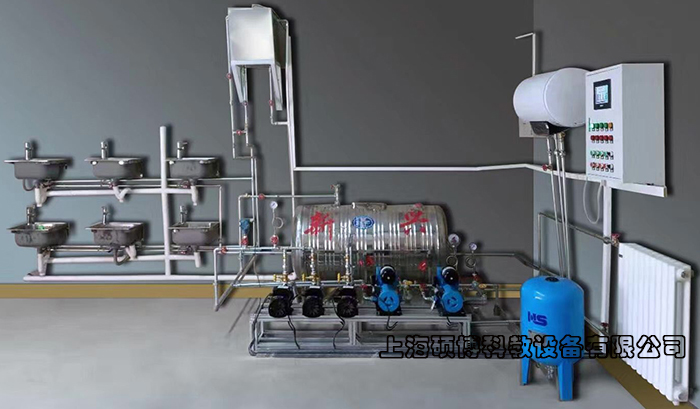 1、生活給水系統(tǒng):主要有給水箱、給水泵、給水管道、壓力變送器、脈沖水表、水龍頭和淋浴頭等組成。管路采用不銹鋼管進(jìn)行設(shè)計(jì),可進(jìn)行不銹鋼管的切割、安裝和通水試驗(yàn)操作,通過(guò)控制系統(tǒng)可實(shí)現(xiàn)生活給水系統(tǒng)的變頻恒壓供水功能,實(shí)現(xiàn)單泵變頻控制或雙泵切換控制等功能;通過(guò)脈沖式水表可以完成用水量的計(jì)量。
