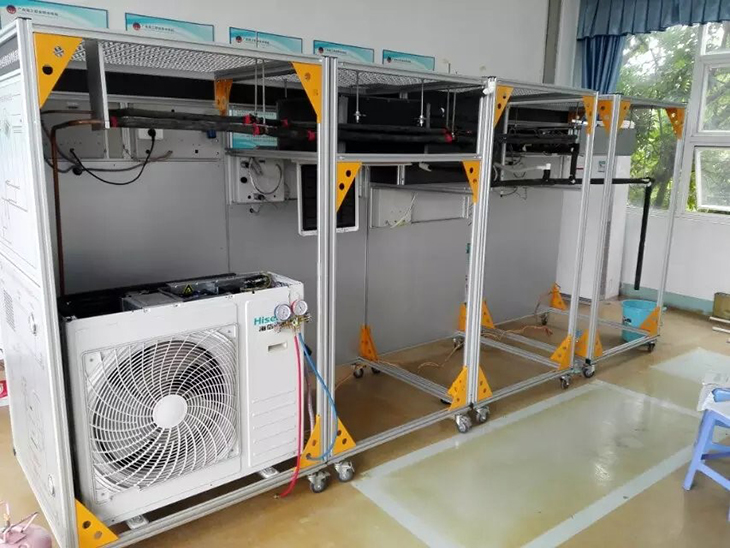 實(shí)訓(xùn)裝置采用移動框架4040鋁型材結(jié)構(gòu),安裝好后可固定位置,防止移動而牽動制冷系統(tǒng)管路。整個(gè)模擬房頂采用1.5MM的網(wǎng)多功能網(wǎng)孔板設(shè)計(jì)使用專業(yè)家用中央空調(diào)專用吊架。掛壁式后安裝板同樣也采用的網(wǎng)多功能網(wǎng)孔板設(shè)計(jì).