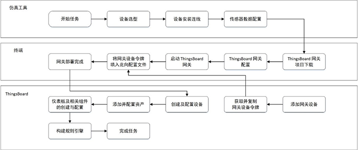 智慧溫室案例,引入了ThingsBoard IoT Gateway開源解決方案,在AIoT平臺的仿真工具中部署ThingsBoard gateway網關,以連接ThingsBoard云平臺,便于上送溫濕度傳感器數(shù)據(jù),搭建恒溫機執(zhí)行器模塊;ThingsBoard平臺,用戶可在儀表盤內添加設置智慧溫室場景、溫濕度顯示設備等組件,獲取仿真實驗中上送的虛擬數(shù)據(jù),以動態(tài)曲線的形式作可視化呈現(xiàn);用戶還可根據(jù)案例要求,在ThingsBoard平臺的規(guī)則鏈庫中,自主編輯設定規(guī)則引擎,實現(xiàn)智慧溫室的恒溫控制與異常告警。
