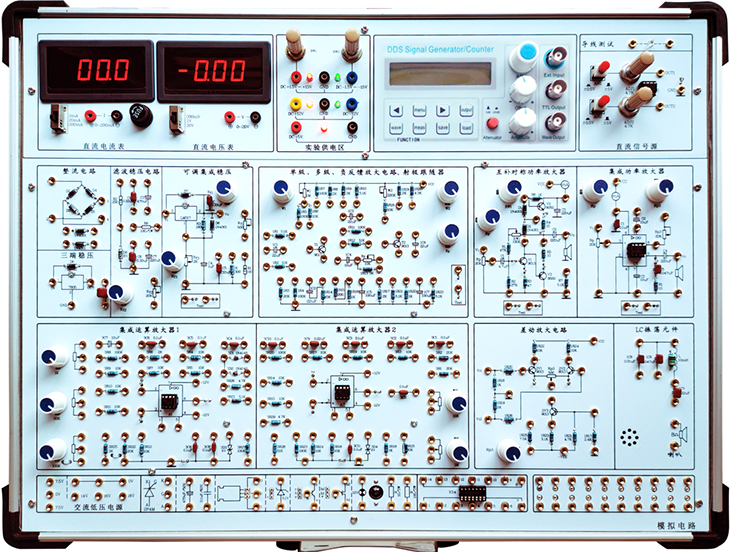 模擬電路實驗箱由鋁木合金箱體、高性能線性電源、和實驗電路板組成。其中實驗電路采用固定功能模塊方式,電路原理和元器件符號清晰,實驗用元器件可以焊裝在線路板的反面,安全可靠,不易損壞,也可以裝在線路板的正面,元件直觀可見,感性認識強,正面還有實驗電路原理圖,使學生在實驗時對原理一目了然。