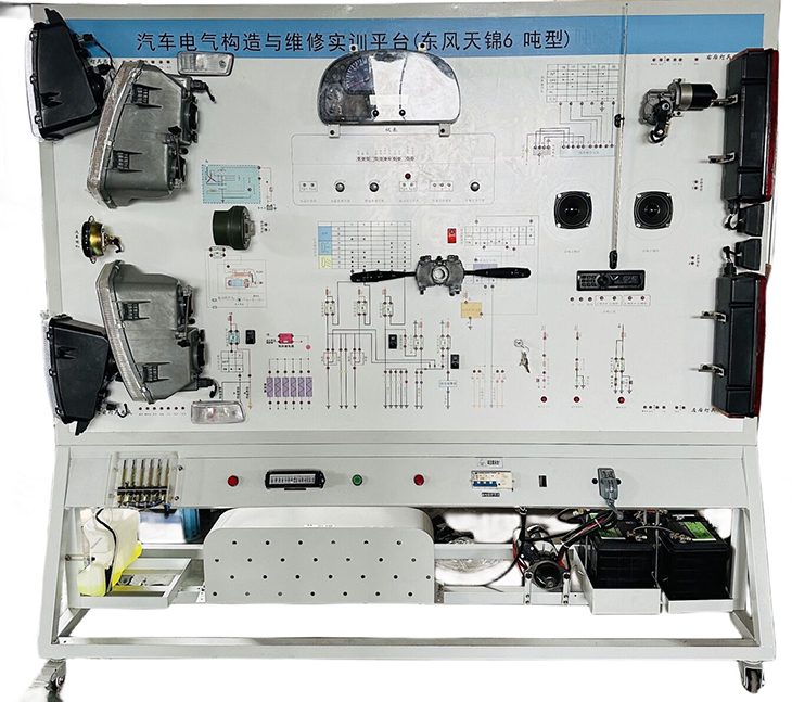 該設備采用全新東風天錦6 噸型柴油機整車電器實物為基礎,充分展示汽車儀表系統(tǒng)、燈光系統(tǒng)、雨刮系統(tǒng)、喇叭系統(tǒng)、發(fā)動機電器系統(tǒng)、起動系統(tǒng)和充電系統(tǒng)等汽車電器各系統(tǒng)的組成結構和工作過程。適用于學校對整車電器理論和維修實訓的教學需要。