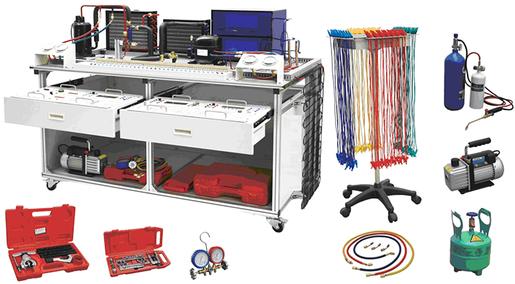 1、實(shí)訓(xùn)臺采用鋁型材臺架加實(shí)訓(xùn)模塊結(jié)構(gòu),裝置采用一體化設(shè)計,由導(dǎo)軌式鋁合金安裝平臺、空調(diào)系統(tǒng)、電冰箱系統(tǒng)、電氣控制系統(tǒng)等組成。底部安裝有四個帶剎車的腳輪,可以方便的移動和固定。設(shè)備配置空調(diào)制冷系統(tǒng)管路1套、直冷電冰箱制冷系統(tǒng)管路1套、安全插端子排,壓力表(1.5MPa)2只(3.5 MPa)2只等。
